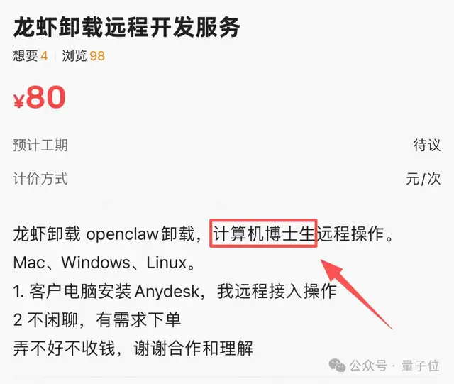 第二类——五十到一百元:此级别主要提供远程协助服务,比如通过向日葵等工具远程帮助用户卸载龙虾。