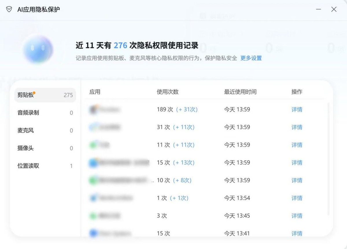 在各类AI应用快速普及的情况下,用户的隐私安全问题日益成为行业关注的焦点。此次腾讯电脑管家18.0版本全新升级,推出了“AI应用隐私保护”功能,能够可视化展示各应用(包括AI应用)的数据权限访问记录,如剪贴板、音频录制、摄像头、麦克风、位置信息等。