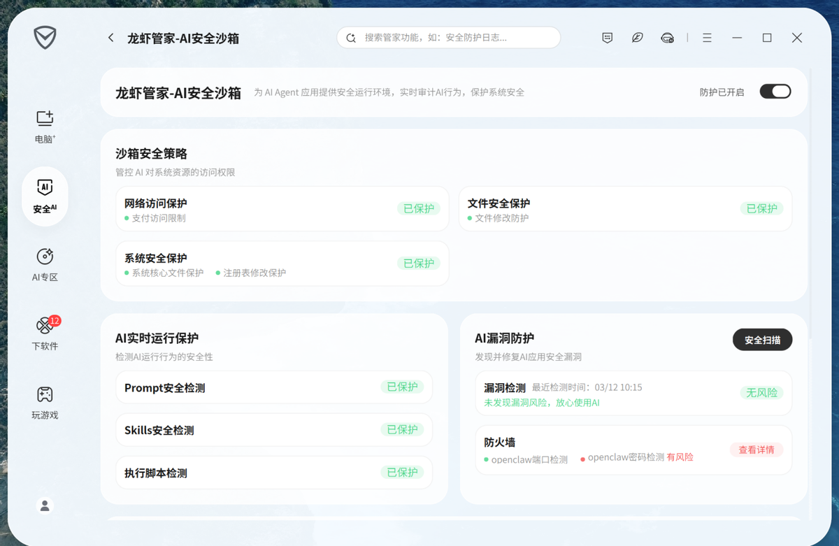 - AI漏洞防护功能可以发现并修复AI应用的安全漏洞,支持定时漏洞扫描,监测AI应用端口暴露和网关密码安全,防止未经授权的访问。