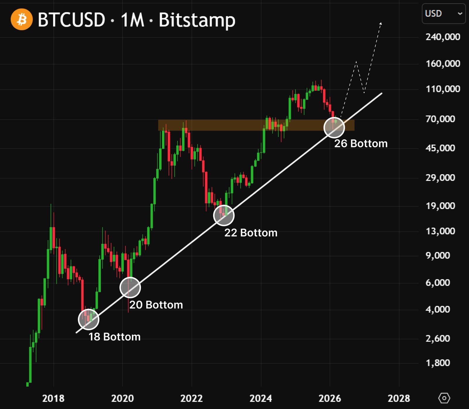 STRC增加了新的需求层次,比特币在月线图上正在重新测试其六年上升趋势线支撑。