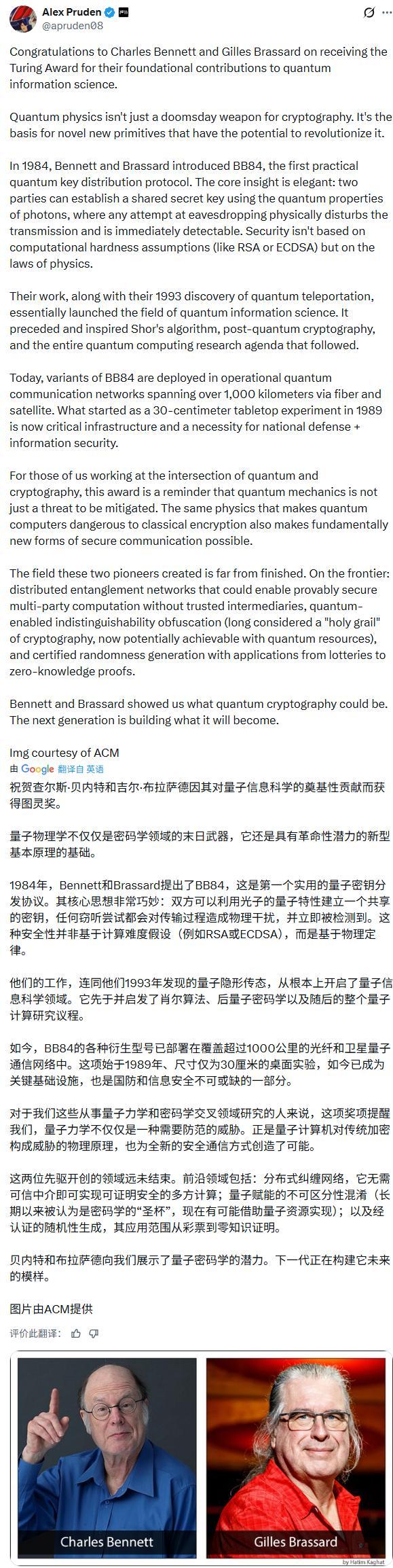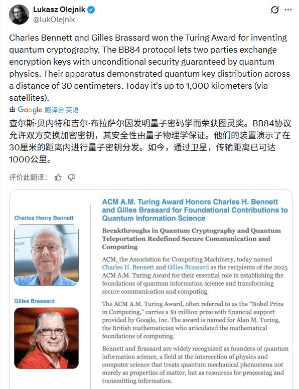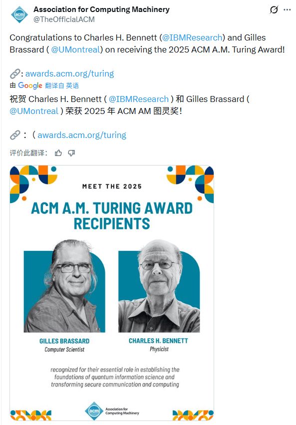 官方颁奖词明确指出,表彰他们“在量子信息科学基础的建立以及安全通信和计算领域的变革方面所作出的关键贡献”。