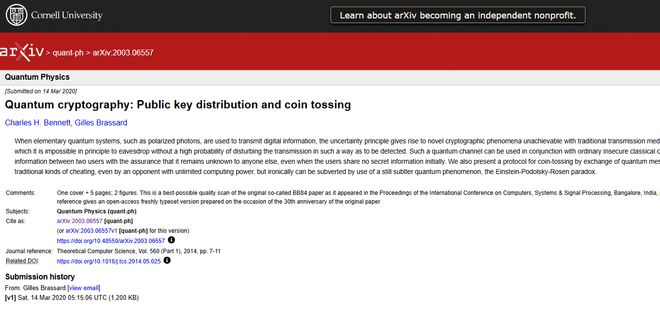 那一年,贝内特和布拉萨德发表了题为《量子密码学:公钥分发和抛币》的论文,提出了后来被称为BB84的通信协议,名字来源于两人姓氏首字母和年份。