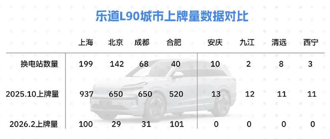 2025年10月,乐道L90获得了历史最高销量1.17万辆,36氪整理了该月乐道L90上牌量两级的八座城市的销量与换电站数量。