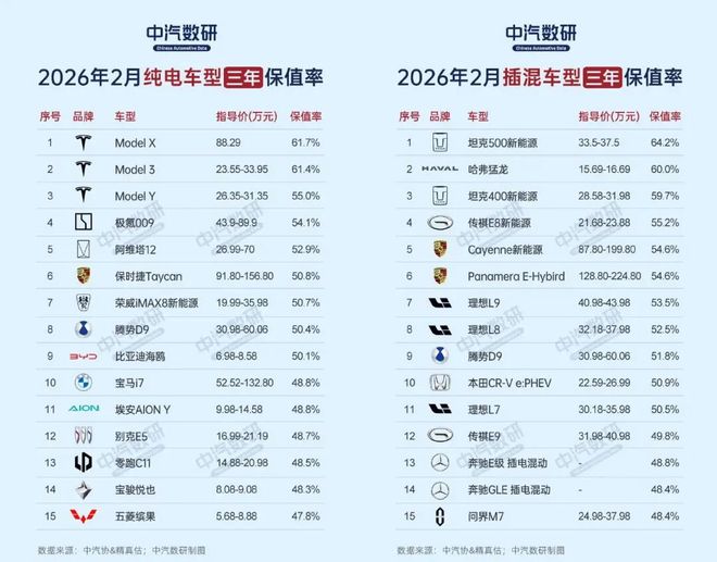 根据中汽数研2026年2月的数据,在一年车龄保值率榜单中,问界M9同时位居双榜榜首,但插混车型保值率较纯电高2%,实际价差约为1万元。