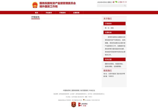 国务院国资委官方网站上已增设了相关页面介绍该机构,局长一职由朱凯担任。具体部门设置包括国际化经营处、风险防范处、监督治理处以及应急管理处。
