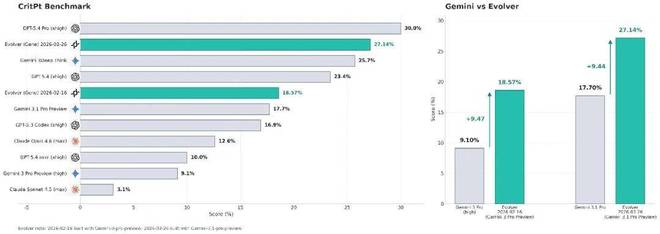 为了拿数据说话,EvoMap 团队把 Evolver 直接拉到 CritPt 这个公开的前沿物理基准上跑端到端结果。