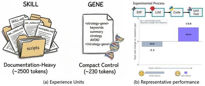 论文先做了最直接的对比:同样的底层经验,分别打成~2,500 token 的 Skill 包和~230 token 的 Gene 对象。