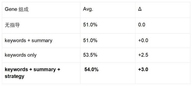注意第二行:keywords + summary 反而回到无指导基线。真正把表现拔起来的是 strategy 这一层。同样的字数,组织成「摘要」没用,组织成「策略」才有用。