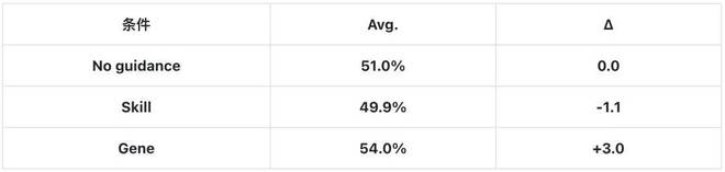 完整 Skill 包在两模型平均水平上低于无指导基线 1.1pp,更短的 Gene高出 3.0pp。绝的一点是:Skill 不是均匀地差,它在弱模型 Flash 上有提升(41.8→49.0),但在强模型 Pro 上狠狠拖后腿(60.1→50.7)—— 长 Skill 把 Pro 的固有能力直接压住了。