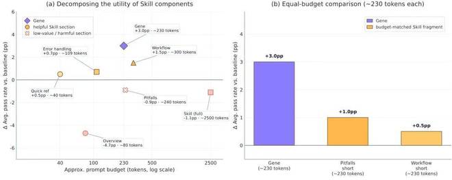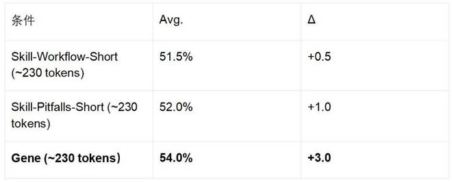 论文专门中用预算对齐实验把 Skill 的有效部分截短到和 Gene 一样的 230 token: