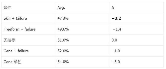 把失败往 Skill 或自由文本里塞,全部低于无指导基线。