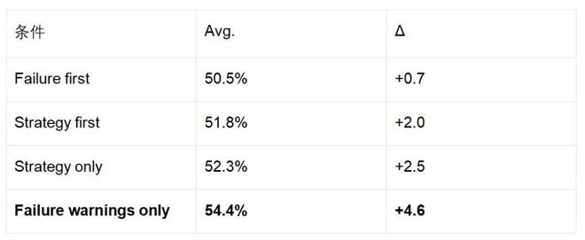 最强的不是「失败 + 策略」混合体,也不是「策略 only」,而是failure warnings only——把失败蒸馏成一句句独立的「AVOID xxx」,反而比保留策略本体还强。