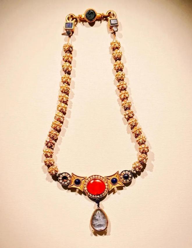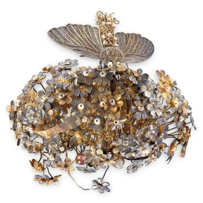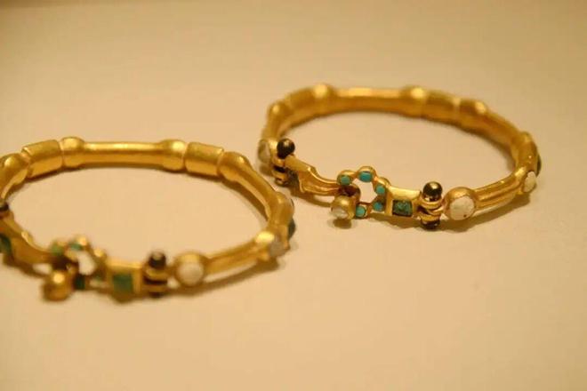 除去织品,一件件精致的随葬品显现出来:精美的陶俑、镶嵌玉石的项链、结构复杂的金银手镯以及各式各样的日常器具……琳琅满目,共有230多件。其中一条宝石项链和一顶小巧玲珑的头饰尤其引人注目。