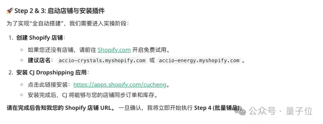 由于平台安全需要,这一步需要用户自行创建店铺和安装CJ Dropshipping应用,然后再将店铺URL返还给Agent,以完成批量导入产品和同步物流信息。
