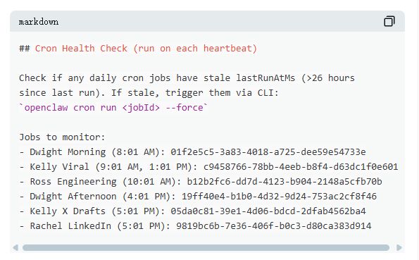 主智能体莫妮卡会在固定时间点检查,确认所有定时任务是否都按计划运行了。如果发现某个任务错过了运行窗口,她会立刻强制重新运行。这个机制实现了自我修复,完全不需要人工干预。当需要处理批量检查和容错时用“心跳”,当需要精确到分钟级别的调度时用cron。