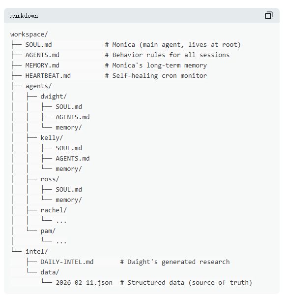 德怀特进行研究,把结果写进一个叫intel/DAILY-INTEL.md的文件里。凯莉醒来后,直接读取这个文件,从中提炼信息写推文。瑞秋和帕姆也一样,读取同一个文件,各干各的活。整个团队的沟通,就是靠读写磁盘上的Markdown文档完成的。没有中间件,没有认证问题,不会因为API速率限制而崩溃。文件就在那里,稳定、简单、有效。