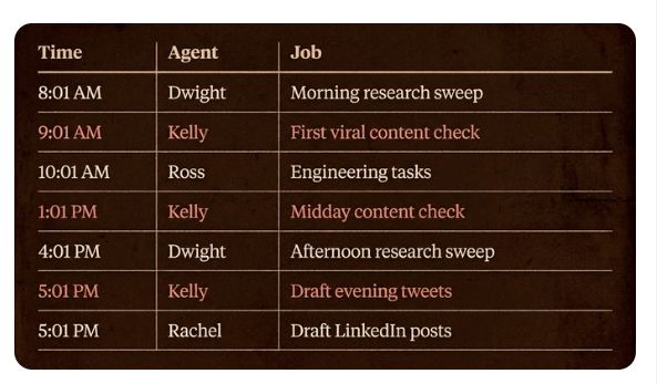 萨布给每个智能体都设定了定时任务,也就是cron调度。顺序很重要:德怀特最先开始研究,因为他产出的是原料。几小时后,凯莉和瑞秋这些内容加工者再开始工作。整个流程就像一条流水线,环环相扣。