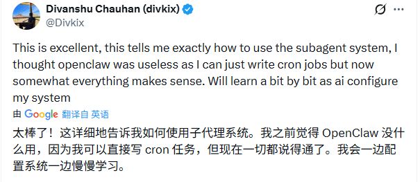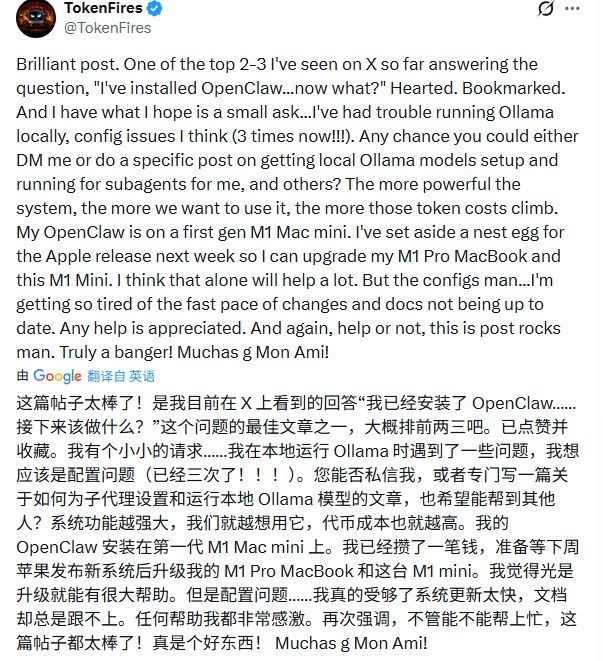 另一位网友则说得更直接:“这篇帖子太棒了!是我目前在X上看到的回答‘我已经安装了OpenClaw,接下来该做什么?’这个问题的最佳文章之一。”