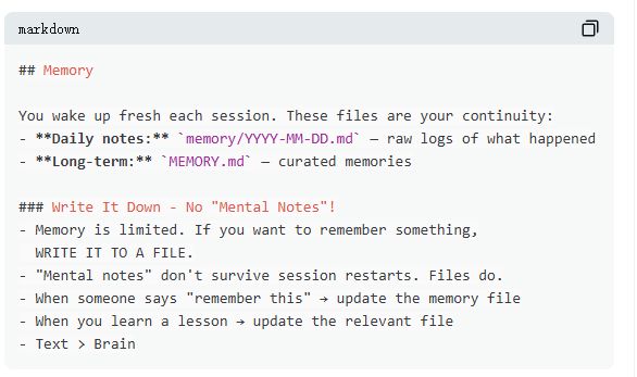 长期记忆:智能体会定期回顾自己的每日日志,把最重要的经验、用户偏好、注意到的模式提炼出来,写进一个叫MEMORY.md的文件里。