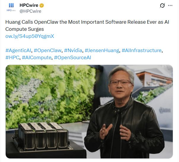 最近关于OpenClaw的讨论越来越热。英伟达CEO黄仁勋在摩根士丹利会议上发言时,专门提到了这个框架。他说:“看看OpenClaw及其采用速度,Linux大概用了30年才达到这个水平,OpenClaw只用了3周。它现在是历史上下载量最高的开源软件!”