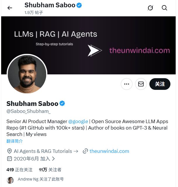 萨布的身份有点特殊。他不仅是谷歌的高级产品经理,还是编程社区Unwind AI的创始人,同时维护着一个在GitHub上拥有99.5k颗星的超火代码库Awesome LLM Apps。