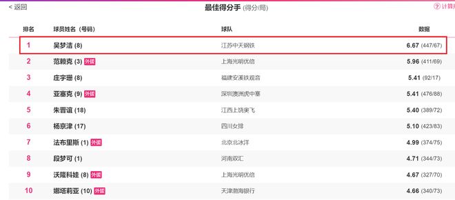 在本赛季联赛中,吴梦洁是进攻效率最高的球员,她局均得到6.67分排名第一,上海女排外援范赖克以局均得到5.96分排名第二,回归中国女排联赛的庄宇珊局均得到5.41分排名第三。此外,吴梦洁本赛季在联赛总共得到447分排名联赛总得分榜第二,仅次于深圳女排外援亚塞克的476分。