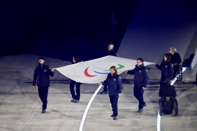 在意大利奥运选手的帮助下,残奥会旗帜在舞台上缓缓升起,并交给了意大利国民保护部门。随着会歌响起,旗帜随之飘扬。