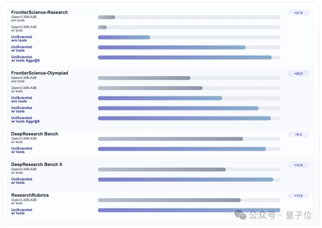 UniPat AI通过UniScientist直接回应了这一技术缺陷:即使只有30B参数量的UniScientist也能实现自主科学研究的能力。