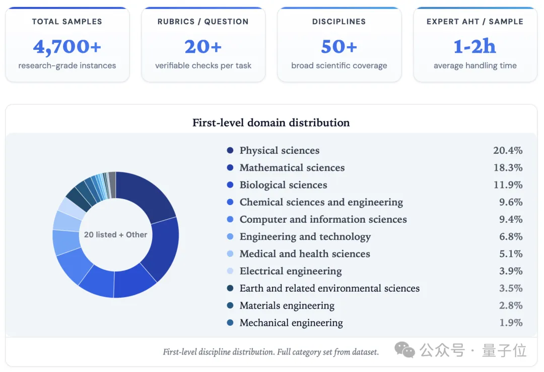 目前的数据集正在不断扩展中,包括超过4700个研究级实例,每个实例附有20+条检验标准,并覆盖50+学科及400+研究方向。专家每标注一条样本平均需要1-2小时的时间。涉及领域从量子物理和有机化学到社会文化人类学和计算语言学均有涵盖。