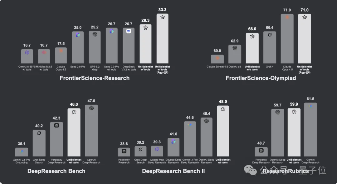 而在DeepResearch Bench、DeepResearch Bench II和ResearchRubrics等分布外基准测试中,UniScientist的表现与一系列顶级封闭源系统相当。