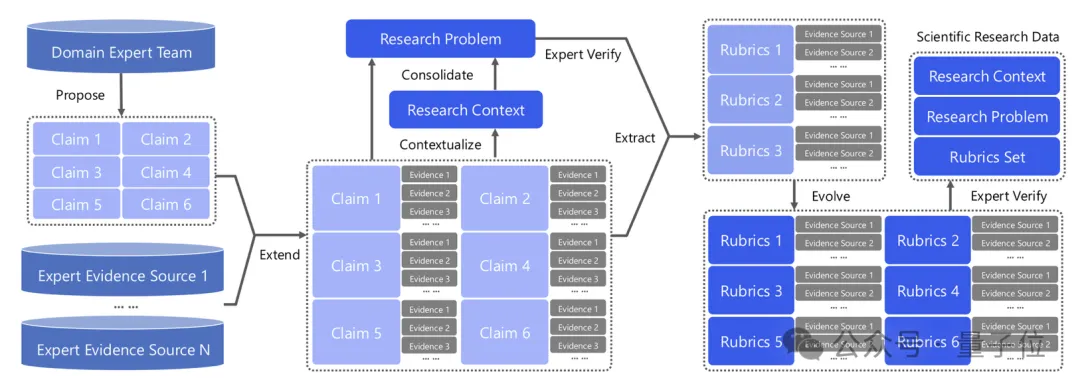 同时生成评测标准(Rubrics),这些不是关于文风或格式等表面质量的评估,而是关注具体科学发现是否达成。