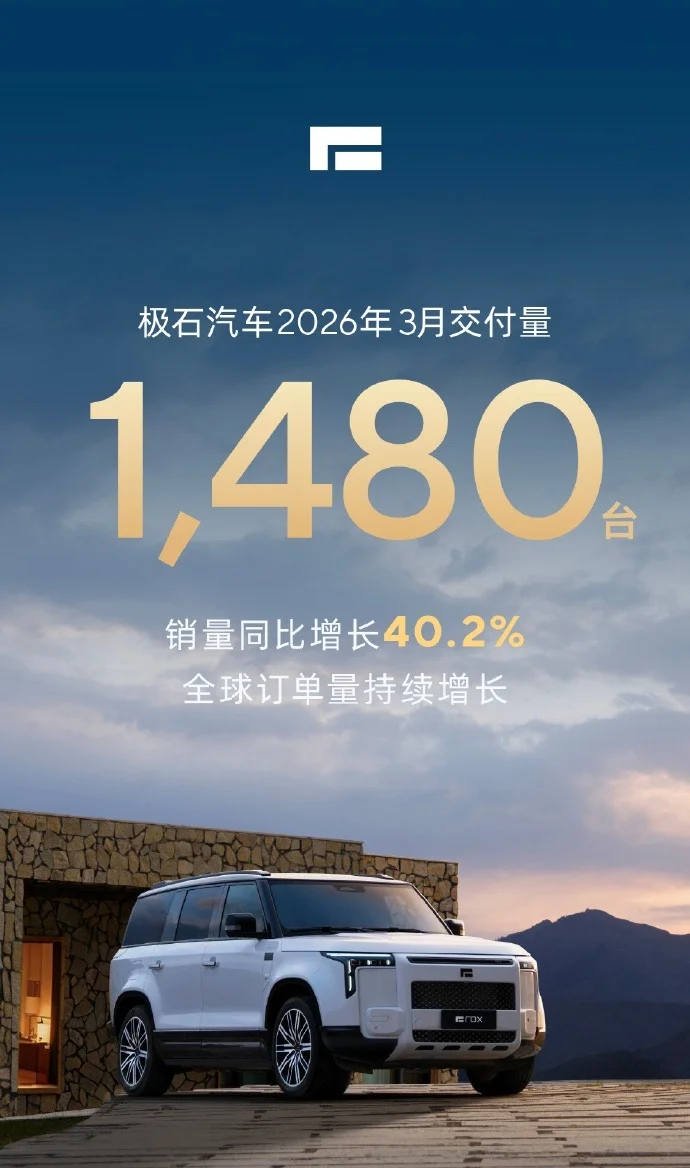 凤凰网科技讯 3月31日,极石汽车公布2026年3月交付量:共计交付1480辆新车,销量同比增长40.2%。