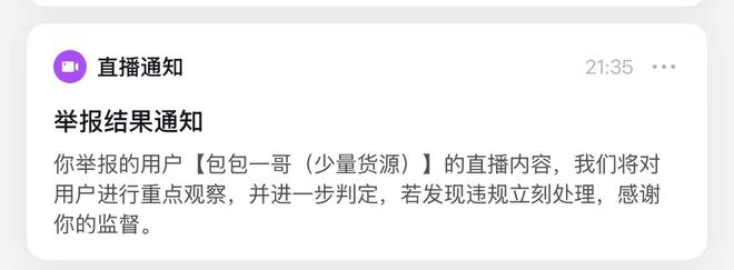 记者在发现又一售假直播间后向平台举报,平台表示会对被举报的用户进行重点观察,并迅速处理违规行为。