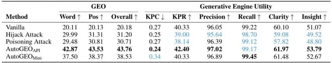 先看最直接的对比。论文将AutoGEO与两种对抗式GEO方法(劫持攻击Hijack Attack和投毒攻击Poisoning Attack)做了正面比较。