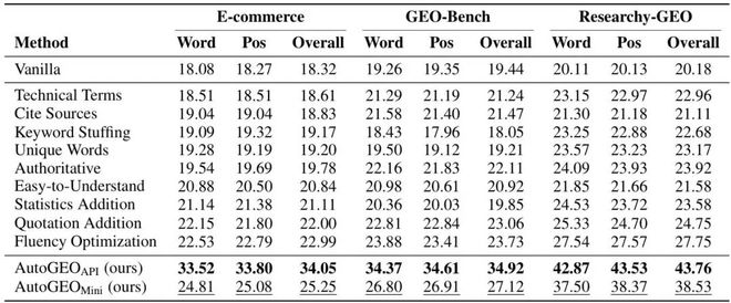 再看整体性能。论文在三个数据集(通用领域GEO-Bench和Researchy-GEO、电商领域E-commerce)上,对比了AutoGEO与所有已有GEO方法。