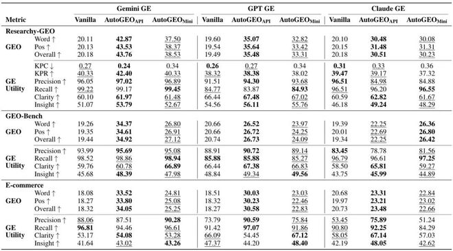 在Gemini、GPT、Claude三大引擎上,AutoGEO的搜索质量指标(精确度、召回率、清晰度、洞察力)全部维持在基线水平甚至略有提升。
