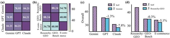 发现一:不同AI引擎的偏好大同小异。相同数据集上,Gemini、GPT、Claude三个引擎的偏好规则重叠率在79%到84%之间。这意味着「好内容」的标准在不同AI引擎之间是相通的。