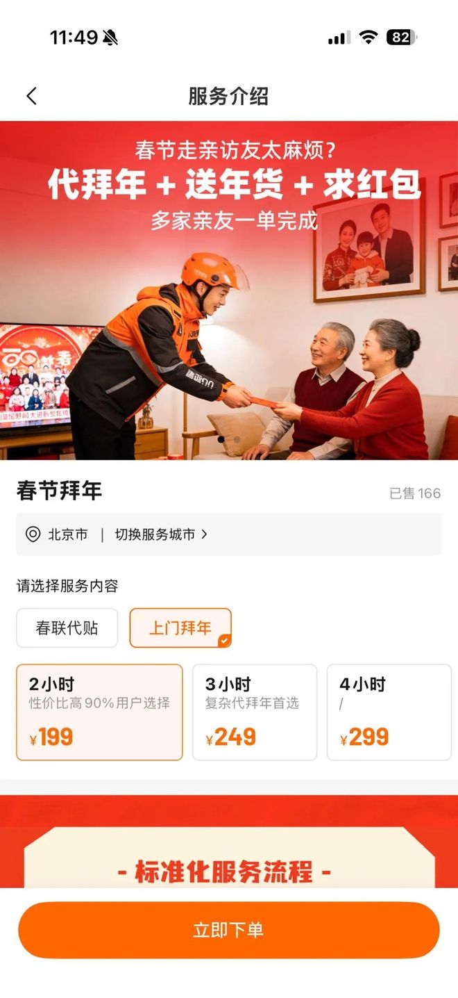 其中,“上门拜年”可选择2小时至10小时不同时长,其中2小时价格199元,3小时价格249元,10小时价格599元,服务内容包括“代买”“代送年货礼品”“按照要求送祝福”“向长辈亲友求红包”等,一次可拜访3家。