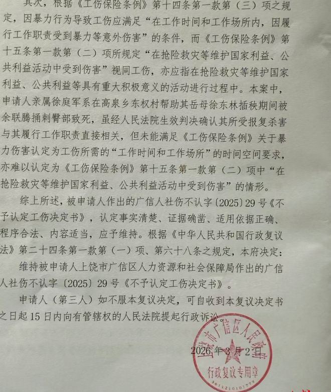 随后,丹丹再次申请行政复议,2026年3月,广信区人民政府行政复议决定书显示,本案中,徐庭军系在帮助其岳母插秧期间被捅刺臀部致死,虽经人民法院生效判决确认其所受报复杀害与其履行工作职责直接相关,但未能满足《工伤保险条例》关于暴力伤害认定为工伤所需的“工作时间和工作场所”的时间空间要求,亦难以认定为《工伤保险条例》第十五条第一款第(二)项中“在抢险救灾等维护国家利益、公共利益活动中受到伤害”的情形。决定维持广信区人社局此前作出的《不予认定工伤决定书》。