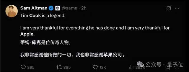 他称赞库克是传奇人物,并表达了对苹果及其同仁的感激之情。