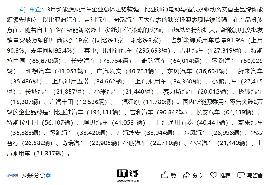 从新能源乘用车企业来看,3月份市场表现较为强劲。据统计,月度批发销量超过万辆的厂商有19家,较去年同期增加了1家,并且比上个月多出3家,这些企业的总销量占到了当月新能源乘用车总量的91.9%。