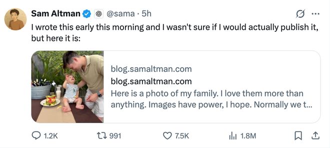 奥特曼在随后发布的长文中表示自己平安无事,并分享了一些家庭照片,流露出一种心有余悸的情绪。他在文章中反思了自己的过失与骄傲,特别是对舆论煽动可能带来的危险有所警惕。