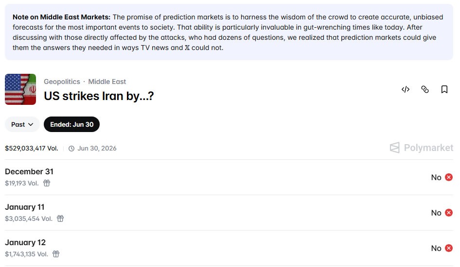 在周六,Polymarket平台上的多个押注被广泛传播开来。据称六个新注册的账户通过押注美国对伊朗采取军事打击的时间窗口,获得了大约100万美元的收益。
