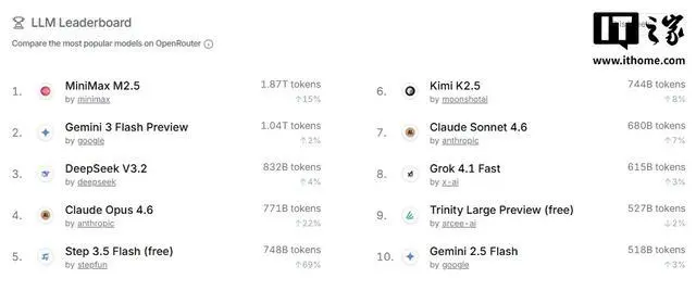 在具体排名上,MiniMax旗下的M2.5模型以1.87万亿Token的周调用量连续保持在全球首位,并且环比增长了15%。DeepSeek V3.2则紧随其后,凭借0.83万亿Token的成绩位列第三,周调用量小幅提升了4%。特别值得一提的是,阶跃星辰推出的Step 3.5 Flash模型表现出色,以0.75万亿Token的调用量环比增长了69%,成功挤入全球第五的位置。