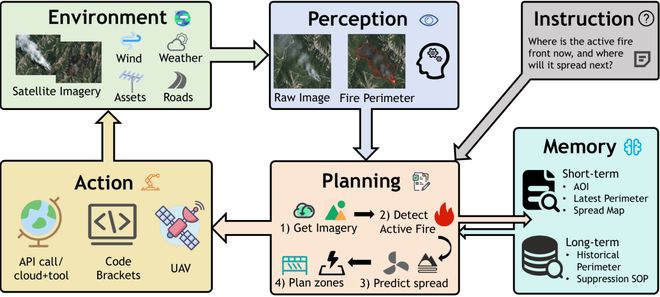 图2展示了智能体的核心模块:感知、规划、记忆、动作,以及它们与环境的交互过程。例如,在森林火灾监测的例子中,智能体通过卫星影像感知火情,结合气象数据规划预测模型,调用无人机执行侦察任务,并将结果存入记忆库供后续使用。