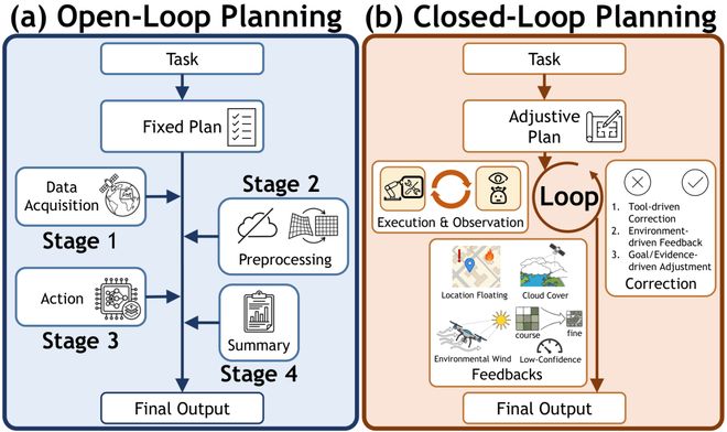 - 闭环规划:动态调整计划。例如云层遮住光学影像,智能体立刻改用雷达数据继续分析,或重新调度卫星获取新影像。