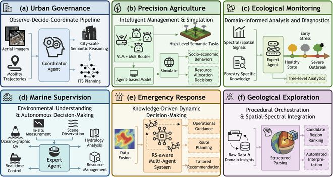 图 7:智能体在城市治理、精准农业、生态监测、海洋监管、应急响应、地质勘探中的典型应用。