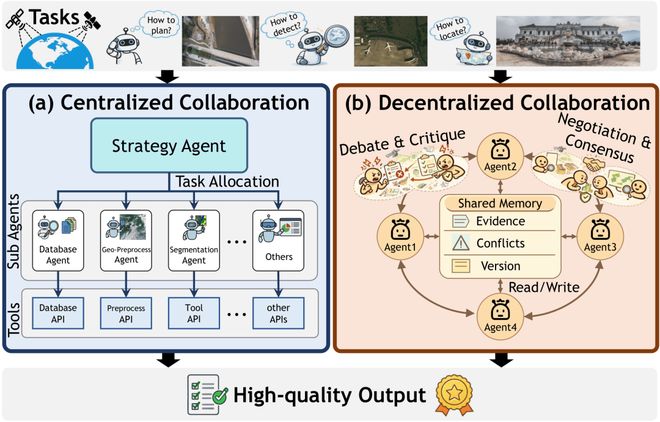 面对全球尺度的监测或复杂灾害响应,单一智能体力不从心。综述区分了两种协作模式: