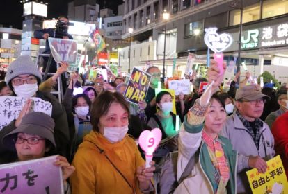东京池袋站前,抗议民众聚集手持标语表达不满情绪。