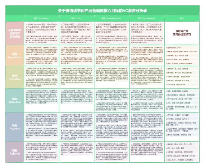 - Job to be Done理论:这是衡量客户维度是否存在浪费的标准之一,该理论指出用户并不是为了使用某个产品而购买它,而是“雇佣”这个产品来完成他们内心中的重要任务。例如,微信读书被“雇用”的目的包括对抗焦虑、促进亲密关系、查找文献资料以及展示自己是个爱学习或喜欢阅读的人等,如果运营策略不能针对这些真实需求,则会造成资源浪费。